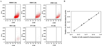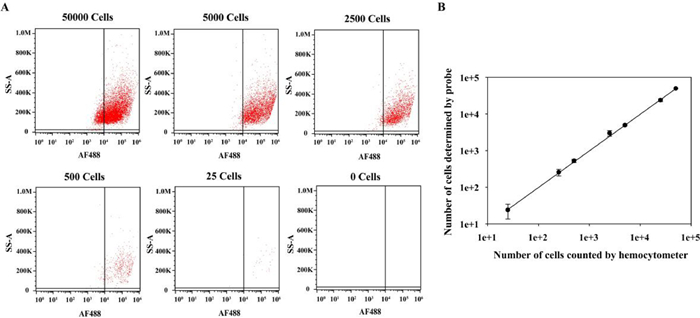 | Fig. 4. (A) Flow cytometry assays of SMMC-7721 cells with decreasing cell number from 50,000 to 0 in 200 µL of binding buffer after incubation with Apt-trigger/H1-ATP aptamer/H2 plus ATP. (B) The corresponding calibration curve illustrating the linear relationship between the cell number detected by this strategy and the cell number counted by the hemocytometer. The error bars represent the standard deviation of three repeated experiments. | |