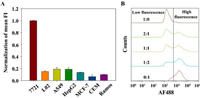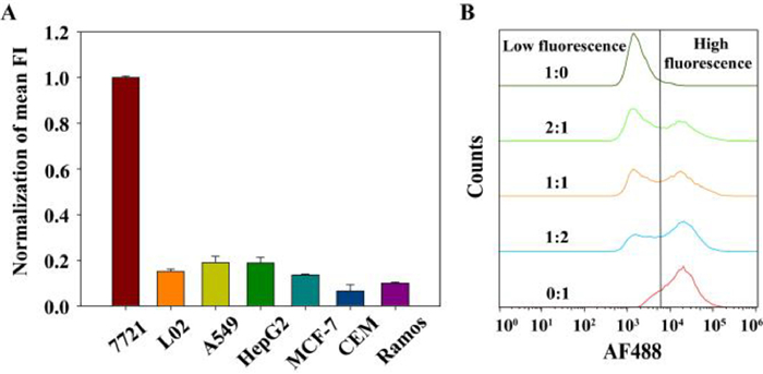 | Fig. 5. (A) Normalization of the mean fluorescence intensity (FI) of the target SMMC-7721 (7721) cells and other control cells (L02, A549, HepG2, MCF-7, CEM and Ramos cells) incubated with Apt-trigger/H1-ATP aptamer/H2 plus ATP. The error bars represent the standard deviation of three repeated experiments. (B) Flow cytometry assays of the cell mixtures incubated with Apt-trigger/H1-ATP aptamer/H2 plus ATP. The ratios of L02 cells to SMMC-7721 cells were 1:0, 2:1, 1:1, 1:2, and 0:1, respectively. | |