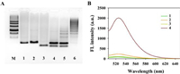 | Fig. 2. (A) 3% Agarose gel electrophoresis imaging of the ATP-activated HCR assembly. Lane M: 20 bp DNA marker; Lane 1: Apt-trigger; Lane 2: H1-ATP aptamer; Lane 3: H2; Lane 4: H1-ATP aptamer + H2; Lane 5: Apt-trigger + H1-ATP aptamer + H2; Lane 6: Apt-trigger + H1-ATP aptamer + H2 + ATP. (B) Fluorescence spectral responses obtained from different reactions. Curve 1: H1-ATP aptamer + H2; Curve 2: Apt-trigger + H1-ATP aptamer + H2; Curve 3: H1-ATP aptamer + H2 + ATP; Curve 4: Apt-trigger + H1-ATP aptamer + H2 + ATP. | |