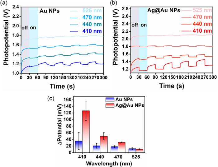 | Fig. 2. Comparison of the photoelectrochemical (PEC) characterization between Au and Ag@Au NPs under different wavelengths with the same light intensity. Plasmon excitation-induced potential shifts on the electrode consisting of Au NPs (a) and Ag@Au NPs (b) supported on an indium tin oxide (ITO) substrate, respectively. The electrode was immersed in 0.5 mol/L potassium nitrate and 5 mmol/L sodium citrate, followed by the irradiation of 410, 440, 470 and 525 nm light with an intensity of 200 mW/cm2. (c) Histogram comparison for the difference of photopotential between Au and Ag@Au NPs. | |