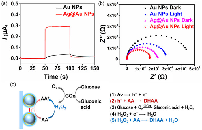 | Fig. 3. Photoelectronic response (a) and EIS (b) of Ag@Au compared with that of Au NPs in phosphate buffer (PB) solution containing AA under dark and light, respectively. (c) Scheme of the fabrication of photoelectrode and the design of PEC enzyme sensor based on the multiplied interband hot holes in Ag@Au. | |