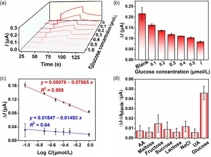 | Fig. 4. (a) Photocurrent response of Ag@Au NPs with different concentrations of glucose (0.1 µmol/L to 1 µmol/L) irradiated by 410 nm light of 200 mW/cm2. The light was turned on at 50 s and off at 100 s. (b) Corresponding histogram of the change in photocurrent after the addition of glucose. ΔI is defined as the difference between I and I0, where I is the photocurrent at 100 s and I0 is the dark current at 50 s. (c) Linear calibration plot (ΔI vs. the logarithm of glucose concentration) for glucose detection from 0.1 µmol/L to 1 µmol/L under the light (red line) and in dark (blue line). Error bars represent the standard deviations from six repetitive experiments. (d) Specificity test of the prepared PEC sensor for glucose. The effect of adding different substrates on the photocurrent response for the Ag@Au modified electrodes is recorded. ΔIblank is resulted from the sample without any substrates. Here, the blank solution is 38 mL PB containing 20 mmol/L AA. The final concentrations of all substrates are 1 µmol/L. Other conditions were the same as those used in the sensitivity study. All experiments were repeated three times. | |
