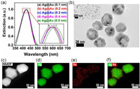 | Fig. 1. Characterizations of the synthesized core-shell Ag@Au NPs. (a) UV–vis spectra for Ag@Au NPs comprised of 30 nm Ag core and Au shell with different thicknesses. (b) Representative TEM images of the prepared Ag@Au NPs. (c) Low-magnification HAADF-STEM image and the corresponding EDS mapping images related to the elements Ag (d), Au (e), and the overlap of Ag and Au (f). | |