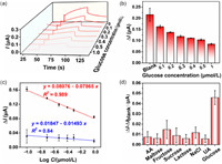 By taking the advantage of the improved amount of interband hot holes toward AA oxidation from Ag@Au NPs, a sensitive PEC enzyme sensing strategy for glucose detection is constructed. As depicted in Fig. 4b, different glucose concentrations generate variable photocurrents, which convert biological signals into electrical signals. The linear regression equation of the photocurrent could be expressed as ΔI = 0.08076 − 0.07865logC (where ΔI = I − I0; I0 is the initial current before light illumination, and I is the photocurrent at the end of light illumination), with a correlation coefficient R2 = 0.989 (Fig. 4c, red line). However, the change of current under the same time interval but without light excitation is very little (Fig. 4c, blue line). It means that the improvement of detection performance is mainly ascribed to the Ag@Au enhanced interband hot hole production under light excitation. Notably, for Au NPs, the photocurrent response does not depend on the glucose concentration, making it impossible to establish a linear range (Fig. S10b). Thus, compared with Au NPs, the Ag@Au NPs accumulating interband hot holes show an extended linear range of 0.1–1 µmol/L and a lower limit of detection (LOD) of 0.077 µmol/L at a signal-to-noise ratio (S/N) of 3. Benefiting from the characteristics of Ag LSPR-improved interband transition of Au, the PEC enzyme biosensor based on Ag@Au achieved satisfactory sensitivity. Particularly, the performance of the proposed biosensor is at the top of the range compared with other recently reported PEC or electrochemical glucose biosensors (Table S1 in Supporting information). The enhanced PEC sensing performance is attributed to the hot-hole harvesting at the particle's surface from the interband transition of Au which is multiplied by the LSPR of the Ag core. Anti-interference ability is one of the critical indexes to evaluate the practicability of a sensor. To challenge the specificity of the proposed PEC strategy, some potential interfering substances such as AA, maltose, fructose, sucrose, lactose, Na+, and uric acid (UA) were investigated using the biosensor constructed in this contribution. As shown in Fig. 4d, the detecting solution of 38 mL PB only containing 20 mmol/L AA was used to produce the initial photocurrent, which is marked as ΔIblank. Following the addition of different substances into the system, only glucose produces an obvious differential of the photocurrent. Therefore, the fabricated biosensor possesses superior selectivity towards glucose, which is mainly due to the specificity of the enzyme.