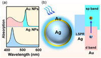 | Scheme 1. Illustration of the absorbance spectra of Au and Ag. (a) Upper: Localized surface plasmon resonances (LSPR) peak of Au nanoparticles (NPs) is around 530 nm. The intraband and the interband transition regimes are shown in cyan and pink (wavelength longer or shorter than 516 nm), respectively. Lower: The LSPR peak of Ag NPs locates in the range of 400–500 nm, which is governed by the intraband transition (blue regime). (b) Schematic of the interband transition of Au (d-band to sp-band) promoted by LSPR excitation of Ag. | |