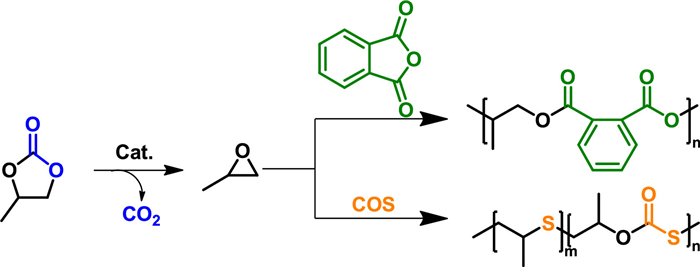 Similarly, the copolymerization of PC with carbonyl sulfide (COS) to prepare polythioethers was reported by Zhang et al. in a one-pot protocol (Fig. 3) [35]. The polymerization involves several sequential steps including in-situ decarboxylation of PC to generate PO, coupling of COS/PO to cyclic thiocarbonate (CTC), decarboxylation of CTC to generate propylene sulfide (PS), and the ROP of PS. The resulting polymer contained mainly thioether units (65–100 mol%) and some thiocarbonate units. By adjusting the polymerization temperature, time, and catalyst, copolymers with different thioether/thiocarbonate unit contents could be obtained, which helped to adjust the degradation performance of the polymer.