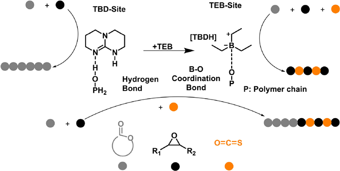 Zhang and co-workers reported the one-pot synthesis of polyester-b-polythiocarbonate block copolymers by the copolymerization of commercially available lactones, epoxides, and COS (Fig. 4) [48]. 1, 5, 7-Triazabicyclo[4.4.0]dec-5-ene (TBD) can activate the cyclic ester through hydrogen bonds and deprotonate alcohol protons to initiate polymerization, forming an alkoxy anion chain growth center. After the introduction of COS, due to the coordination of TEB with the chain anion, the active center switched to the active center bound by TEB [49,50]. And then the alternating copolymerization of COS with epoxides was selectively catalyzed to yield polythiocarbonate blocks. By sequential addition of monomers, nine-block copolymers were synthesized. However, the switching of the growth chain center was irreversible, that is, it was necessary to synthesize the polyester block first, and then synthesize the polythiocarbonate block. Tao and co-workers recently reported the one-pot synthesis of poly(ester-b-carbonate) by the switchable polymerization of O-carbonyl anhydrides (OCAs) and epoxides catalyzed by TEB/onium salt Lewis acid-base pair [51].