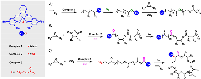 | Fig. 5. Cobalt-mediated switchable catalysis for one-pot synthesis of biodegradable and renewable polymers with different topologies: (A) From OMRP to ROCOP for synthesizing polyacrylate-b-polycarbonates; (B) from ROCOP to OMRP for obtaining polyacrylate-b-polyesters; (C) from ROCOP to radical cyclization reaction for constructing cyclic polymers. | |