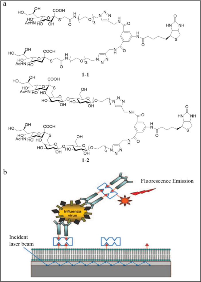 Schmidt and lyer's group reported two fluorescent probes (1–1 and 1–2) using biotinylated biantennary S-sialosides to detect influenza viruses rapidly [43]. The probes contain three components, including biotinylated divalent scaffold, recognition elements (S-sialosides) and oligoethylene glycol spacer (Fig. 1a). 1–1 and 1–2 differ based on the sialic acid configuration. Fluorescent antibodies were used as the reporter and the biotinylated carbohydrate together with the fluorescent streptavidin was used as the detector. Using the carbohydrate analogue of a sandwich immunoassay on the surface of a waveguide-based optical biosensor (Fig. 1b), the background fluorescence was eliminated when the molecules were more than 200 nm away from the surface due to the decreased effect of the evanescent field. Using 1–2, H3N2 emitted a strong signal at the wavelength of 675 nm, while H1N1 had almost no signal, which indicated that the sialoside distinguished H1N1 and H3N2 clearly. However, such a phenomenon could not be observed with 1–1, which suggested that 1–2 was a specific probe while 1–1 was not. The detection limit was 106 viral particles/mL. The achievement of this research is that they find the first influenza capture and reporter pair that was completely based on glycans, and the 1–2 probe was stable and active at ambient temperature.