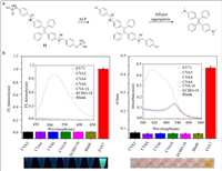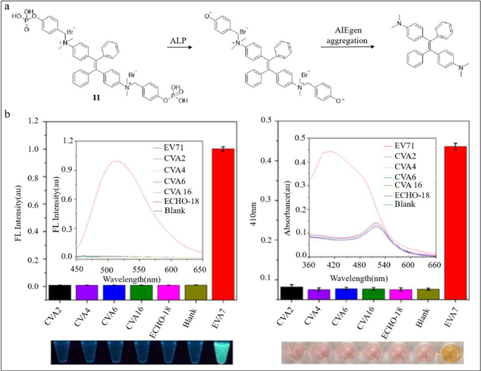 Zhang's group developed a dual probe based on aggregation-induced emission luminogen (AIEgen) (probe 11) [66,67]. The structure of TPE-APP, a water-soluble multifunctional AIEgen which contains enzymatic cleavage sites, is shown in Fig. 11a. With the catalysis of alkaline phosphatase (ALP), the phosphoryl group of TPE-APP was removed. TPE-DMA, the product, is hardly water-soluble with extremely strong fluorescence. However, TPE-APP decreases resulting in the formation of a silver nanolayer around gold nanoparticles (AuNP), which reveals viruses based on color [68]. As a whole, a dual-mode viral analysis based on fluorescent signal and macroscopic color was built (Fig. 11a). In order to validate the selectivity of probe 11 to EV71, several experiments using CVA2, CVA4, CVA6, CVA16, ECHO-18, and EV71 as well as the blank control were conducted. As shown in Fig. 11b, high-intensity fluorescence was detected in EV71, while other samples and the blank control hardly emitted light. The yellow color was observed only in EV71 (Fig. 11b), suggesting that probe 11 was strongly selective for EV71. In addition, the detection limit was 1.4 copies/µL. When the probe was utilized in practical applications, 8 throat and cloacal samples from HFMD patients was tested positive out of 24 samples analyzed by plasmonic colorimetry. Also, two additional samples were determined to be infected by fluorescence. Probe 11 showed 100% precision compared with TaqMan real-time PCR [69]. Probe 11, free of fussy sample preprocessing and expensive testing equipment, is superior due to its convenience and reliability. It is also expected to facilitate the detection of similar viruses such as H7N9 and Zika virus.
