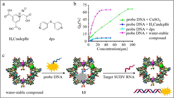 2.3. Fluorescence probes for immune system viruses 2.3.1. Sudan virus (SUDV) probeSUDV, a subtype of ebolaviruses causing fever and bleeding, is characterized by high mortality of 53.76%. Efficient diagnosis and control of SUDV is necessary. Therefore, Chen's group has developed a fluorescent probe based on the metal frame (probe 13) [75]. Probe 13 comprised a metal-organic framework (MOF) and two carboxyfluorescein (FAM)-labeled single-stranded DNA sequences (probe ss-DNA, described as P-DNA). The MOF was synthesized using the metal ion Cu(II) [76] along with organic ligands [77] including asymmetric H3CmdcpBr and symmetric dps, contributing to a unique macroporous structure in three dimensions. The structures of ligands are shown in Fig. 13a. The water-stable compound was prepared from the mixture of CuSO4 and H3CmdcpBr, followed by the addition of dps. Compared to CuSO4 and H3CmdcpBr and dps, the water-stable compound shows the best fluorescence quenching result. Therefore, the water-stable compound was chosen to be the important part of probe (Fig. 13b). As shown in Fig. 13c, the water-stable compound combines with P-DNA via electrostatic interaction, π-stacking effect or/and hydrogen bonds, resulting in fluorescence quenching. In the presence of HIV ds-DNA, rigid triplex structures of HIV ds-DNA and P-DNA were formed by reverse Hoogsteen base pairing. SUDV RNA was also complementary to P-DNA. The rigid triplex structures led to the dissociation of P-DNA from the water-stable compound, resulting in fluorescence. In addition, the limits of detection were 196 pmol/L for HIV-1 and 73 pmol/L for SUDV.