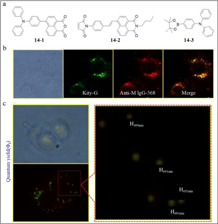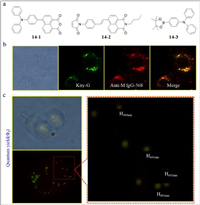 | Fig. 14. (a) The structures of probe 14–1, 14–2, and 14–3. (b) Fluorescent images of probe 14 and anti-M IgG-568 as well as their merge. (c) Sizes of fluorescent dots detected by probe 14. Reproduced with permission [79]. Copyright 2015, Elsevier. | |