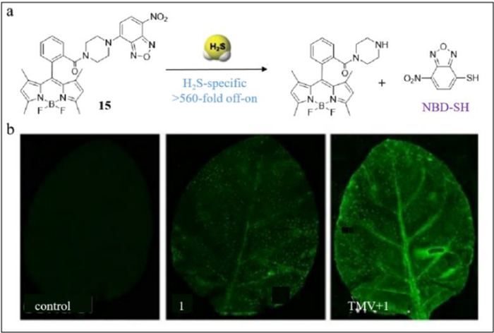Xi's group developed a TMV probe (described as probe 15) containing NBD amine [82] as H2S receptor and 4,4-difluoro-boradiazaindacene (BODIPY) as fluorophore [83]. As shown in Fig. 15a, when H2S excited probe 15 and disrupted C—N bond simultaneously, the BODIPY emitted green fluorescence light and a mercapto group was added to NBD. At 520 nm and under 5 mmol/L, the fluorescence was 40-fold stronger and in the range of 5–50 µmol/L H2S, a linear relationship was observed between fluorescence intensity and H2S concentration. Compared with other probes based on NBD, probe 15 exhibited 560-fold strong fluorescence and > 400-fold selectivity of F/F0s. The ability of probe 15 for the detection of live entities was investigated by Xi's group in live tobacco plants. As shown in Fig. 15b, the tobacco leaf alone was non-blooming. The addition of probe 15 to the leaf without TMV resulted in weak fluorescence. However, when probe 15 was mixed with the TMV infected leaf, the fluorescence was of high intensity.