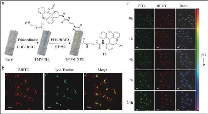Tian's group designed a pH-sensitive single-wavelength excited rated fluorescence probe (probe 16) [85,86], which revealed the site of TMV in different biological environments at different pH levels. In addition, the limit of detection was 12.9 nmol/L at 37 ℃. Probe 16 was made up of three functional sections: TMV, a pH-sensitive fluorophore fluorescein isothiocyanate (FITC) and another fluorophore rhodamine B isothiocyanate (RBITC) insensitive to pH. Upon excitation at 488 nm, FITC and RBITC showed fluorescence peaks at 515 and 575 nm, respectively. The fluorescence intensity emitted by FITC was enhanced as pH increased in the pH range of 5.7–7.4. The peak at 575 nm persisted and was used as an internal standard. Under multiple excitations, probe 16 was characterized by simplicity and low background noise. In addition, to retain the original morphology of TMV as far as possible, the Tian's group assembled exogenous fluorophore on the inner surface of coat protein (Fig. 16a). The two chemical reactive positions on the inner surface were glutamic acid 97 residue (97 Glu) and glutamic 106 residue (106 Glu). The procedures to synthesize probe 16 are described in Fig. 16a. First, the amino groups were inserted between carboxyl groups of 97 and 106 Glu-and amino groups of ethylenediamine. The isothiocyanate groups of FITC and RBITC were combined with the amino groups of TMV-NH-2. To validate the distribution of probe 16, 50 nmol/L LysoTracker® Deep Red was used to label lysosomes. The observed yellow was merged with the red fluorescence from TMV-F & RB and the green emission from LysoTrackerⓇ Deep Red at the coincident sites (Fig. 16b). Thus, the TMV track into lysosomes was determined to be true. To monitor the track of TMV in live cells, co-culture experiments of probe 16 and HeLa cells were conducted. The results presented in Fig. 16c showed that FITC and RBITC emitted rapid fluorescence initially. Subsequently, the green fluorescence from FITC was strengthened, while the red fluorescence from RBITC remained at specific intensity. The total fluorescence turned from green to blue, indicating reduction in the environmental pH. The observation was consistent with endocytosis in lysosomes.