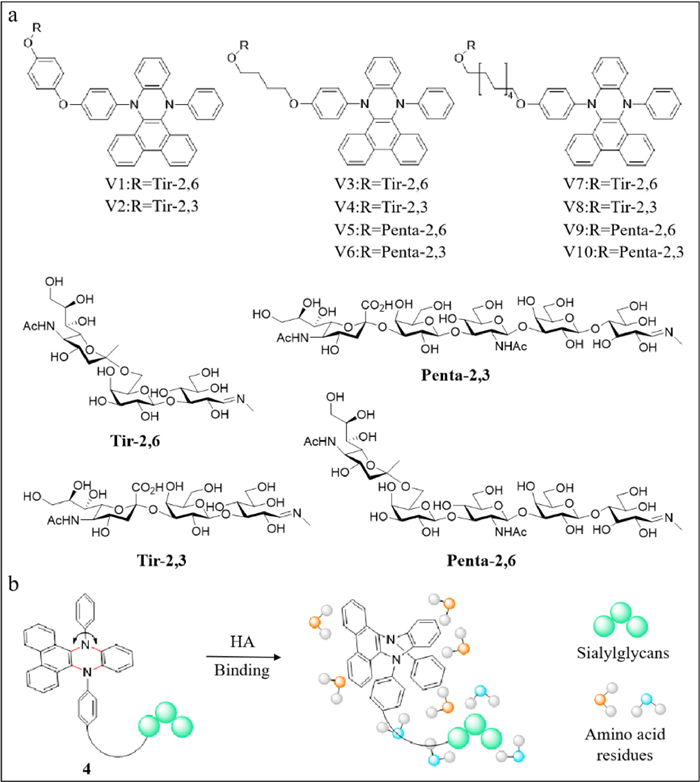 Later, Zhou and He's group developed a more sensitive fluorescent probe (probe 4) (Fig. 4a) [46]. They reported a series of sialyl-glycan-functionalized vibration-induced emissive probes (VIEgens) for specific detection and identification of influenza A viruses. VIEgens V1, V3, V5, V7, V9 are α2,6-linked human receptors and VIEgens V2, V4, V6, V8, V10 are α2,3-linked avian receptors. Binding of probe 4 to the hemagglutinin of influenza A viruses alters the conformation of the probe, resulting in fluorescence and a blue-shifted emission peak (Fig. 4b). Fluorescence spectroscopy revealed the specific binding of probe 4 to the receptor with a significantly altered fluorescence emission profile with a detection limit of 2.84 × 10−3–9.20 × 10−3 HAU 50 µL−1, while the optimal detection range was 0–5.12 HAU 50 µL−1. The fluorescence emission profile also strongly correlated with the change in probe conformation, resulting in variation in response between probes. Accordingly, the ten probes were combined into a high-throughput array successfully and accurately distinguished between influenza A viruses with different specificities and from other viruses via high concentration principal component analysis. The potential of the sensor array to distinguish homogeneous influenza viral mutants was also determined. Finally, the adenovirus vaccine with the sensor array revealed that only the influenza adenovirus vector vaccine significantly changed the fluorescence emission profile, reflecting the probe specificity. Different vaccines were distinguished via principal component analysis based on quadrants and axes. The results contributed significantly to the development of new vaccines. This simple and effective probe is expected to optimize the medical system in underdeveloped regions.
