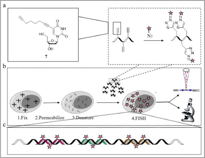 Carell's group later reported a faster fluorescent probe with high signal-to-noise ratio [52]. The traditional fluorescent in situ hybridization (RNA-FISH) carries only a single fluorophore and requires a large number of probes for detection, which increases background noise. Carell's group improved the conventional probe and developed a sensitive fluorescent probe (probe 7) (Fig. 7a) with three fluorophores by incorporating three C8-alkyne-dU residues into each of the 10 oligonucleotides and used click chemistry (a method to synthesis molecules by splicing small moieties) to react with Eterneon-Red 645 azide, and then purified and finally obtained 10 × 3 small FISH probes (Figs. 7b and c). The fixed permeabilized cells were used in quantification, localization and analysis of the transcripts after the probe addition. Compared with the conventional 30 × 1 probe, the 10 × 3 probe emitted a stronger signal with a higher signal-to-noise ratio, resulting in clearer fluorescence image. Among mixed cell populations, the conventional probe could not distinguish cells of different species when the probe concentration was 0.05 ng/µL, while the 10 × 3 probe separated positive green fluorescent protein (GFP) cells from negative GFP cells, and the proportions were observed under blue gating. Also, the 10 × 3 probe was effective in detecting transcribed RNA of endogenous ABL. The 10 × 3 probe was also effective in RNA target imaging. Despite the small number of binding sites of the RNA target, the 10 × 3 probe facilitated the detection of transcribed RNA with red fluorescence after the cells were infected for 4 h. Eventually, additional transcripts were detected, and probe 7 emitted a green signal, reflecting the good sensitivity of probe 7. Probe 7 greatly reduced the number of probes required for FISH and can be utilized to detect low concentrations of transcripts.