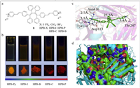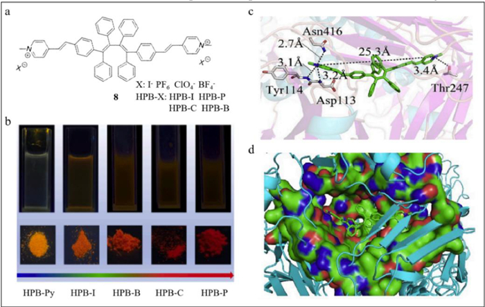 | Fig. 8. (a) The structure of probe 8. (b) The pictures of HPB-Xs under 365 nm UV light. (c) Docking results and interaction between HPB-I and hemagglutinin protein. (d) HPB-I and H5's binding site. Reproduced with permission [56]. Copyright 2021, Elsevier. | |