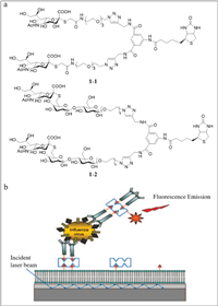| Fig. 1. (a) The structures of 1–1 and 1–2. (b) Diagrammatic sketch of the sandwich "carboassay" on a planar optical waveguide biosensor. Reproduced with permission [43]. Copyright 2008, ACS. | |