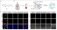 Zhu's group developed a benzothiazole-based G-quadruplex (G4)-targeted fluorescent probe (called ThT-NE and described as probe 12), which can track HCV RNA in real time [71,72]. Probe 12 consisted of electron-withdrawing methylbenzothiazole and electron-donating N,N-diethylaniline (Fig. 12a). The energy-stable angle between methylbenzothiazole and N,N-diethylaniline was 90°, resulting in twisted intramolecular charge transfer (TICT), thereby eliminating the fluorescence of the probe [73]. G4 resisted the twist in ThT-NE and changed the angle to 14° and thus emitted the fluorescence. However, the fluorescence intensity of the mixture of probe 12 and variant HCV or other cell compounds remained at very low level. As a result, probe 12 was used to selectively detect the RNA G4 sequence in vitro. In practice, blood serum sample from hepatitis patient was extracted and stained on probe 12. The single infected cell was observed based on fluorescent signals (Fig. 12b). Compared with the current probe, a molecular beacon with the Cy5/BHQ3 (fluorophore/quencher) pair (MB-C) [74], probe 12 was specific to the G4 structure, as shown in Fig. 12c. To further verify the accuracy of probe 12, an antibody specifically combined with G4 structure (BG4) was used. As shown in Fig. 12c, the fluorescence emitted by probe 12 was almost consistent with that of BG4, which demonstrated accurate recognition. Given that probe 12 could detect HCV without mark and decoration, it could be used to monitor the multiplication of HCV in live cells. As the G4 structure is discovered in other pathogenic RNA viruses, probe 12 can be expected to play an important role in viral analysis in single cells.