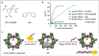 | Fig. 13. (a) Ligand structures of MOF. (b) Fluorescence quenching level of probe DNA interacting with different compounds. (c) Fluorescence quenching and restoration mechanism of probe 13 with SUDV RNA. Reproduced with permission [75]. Copyright 2015, ACS. | |