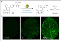 | Fig. 15. (a) The structure and response mechanism of probe 15 with H2S. (b) Fluorescence images of probe 15 on the surface of leaves without/with TMV. Reproduced with permission [83]. Copyright 2018, Wiley. | |
