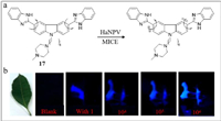 | Fig. 17. (a) The structure of probe 17. (b) Fluorescence images of probe 17 with HaNPV on the surface of the mango leaves. Reproduced with permission [88]. Copyright 2019, ACS. | |