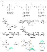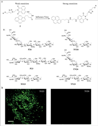 | Fig. 2. (a) The structure of probe 2 and the introduction of the fluorescence response to influenza A virus. (b) The confocal laser scanning microscopy of TO23 and TO26. Reproduced with permission [44]. Copyright 2016, Wiley. | |