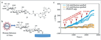 | Fig. 3. (a) The structure of probe 3. (b) H1N1 can be detected by probe 3. (c) QCM signals' change after injecting virus solutions of various HAU. Reproduced with permission [45]. Copyright 2017, ACS. | |