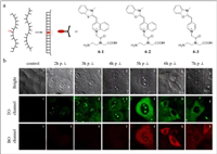 | Fig. 6. (a) The mechanism of probe 6. (b) The second column to the last column are the images obtained by adding the M1 specific 6–3 and the NA specific 6–1 to the cell after infection at the specified time, meanwhile the first column is the control. Reproduced with permission [51]. Copyright 2012, ACS. | |