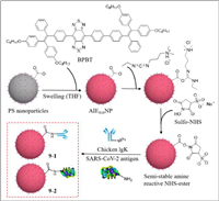 SARS-CoV-2 is highly infectious and insidious. Infected people experience fever, cough, and respiratory distress [57], but there is no specific treatment available. Therefore, the development of a simple and rapid method that can detect SARS-CoV-2 is imperative. Reverse transcription polymerase chain reaction (RT-PCR), which is a common detection method, is expensive and time-consuming. Liu and Li's group reported the use of a lateral flow test strip based on AIE nanoparticles to detect immunoglobulin M (IgM) and immunoglobulin G (IgG) against SARS-CoV-2 [58]. They used BPBT (an AIE dye with near-infrared emission) as the fluorescence unit to eliminate background noise, and synthesized the fluorescent reporter AIE810NP, which exhibited good photostability, thermal stability and colloidal stability, and then modified the surface of AIE810NP with chicken IgY (9–1) and SARS-CoV-2 antigen (9–2). After dropping the serum containing IgM and IgG, IgM and IgG moved forward and combined with 9–2 respectively. Then IgM and IgG bound specifically to mouse anti-human IgM on the M line and mouse anti-human IgG on the G line, and the binding of goat anti-chicken IgY to 9–1 on the C line was used as the quality standard. Using a portable reader under light emitting diode (LED) illumination, the test was validated if the C line emitted fluorescence, and vice versa. The fluorescence from the M and G lines suggested the presence of the corresponding immunoglobulin and therefore yielded a positive result, otherwise, a negative result was confirmed (Fig. 9). The performance of lateral flow test strip was optimal at a readout time of 10 min, while the concentration of 9–2 was 12.5 µg/mL and mouse anti-human IgM and IgG were 0.6 mg/mL. The threshold of the test strip for IgM was 0.200 and the limit of detection was 0.236. The threshold for IgG was 0.737 and the limit of detection was 0.125. AIE810NP test strips were comparable to SERS-based test strips and ELISA in terms of sensitivity and were greater than colloidal gold nanoparticle (AuNP)-based test strips. AIE810NP test strips can be used for early detection of SARS-CoV-2.