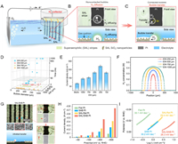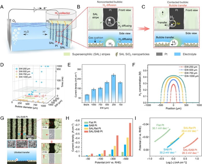 | Fig. 4. (A) Schematic of the superaerophilic (SAL) /flat Pt electrode with enhanced mass transfer. (B) H2 bubbles are not making contact with the SAL stripe. (C) As they grow, H2 bubbles will contact the SAL stripes and be timely transferred through SAL stripes. (D) Statistics of the transfer time of H2 bubbles with different diameters on the SAL stripes with various SAL stripe widths (SWs). (E) Variation of the current density of the SAL/flat Pt electrodes with various electrode widths (EWs) at an overpotential of −350 mV. (F) Simulation of H2 diffusion on the SAL/flat Pt electrodes with various EWs. (G) H2 bubble behaviors and electrochemical tests on the SAL/superaerophobic (SAB) Pt electrode. (H) Current densities of these four electrodes at −50, −100, −300 and −500 mV vs. RHE. (I) Tafel plots of these four electrodes. Reprinted with permission [103]. Copyright 2023, Wiley VCH. | |