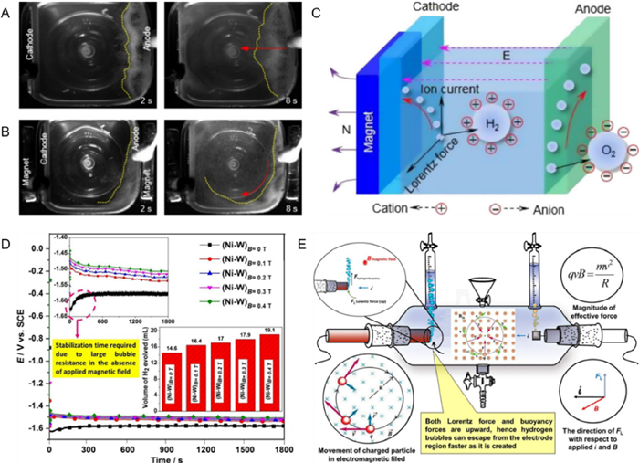 | Fig. 6. (A) Diffusive movement of oxygen bubbles without magnet and (B) directional rotation movement of oxygen bubbles with magnet. (C) Mechanism of gas bubble movement in magnetic field. Reprinted with permission [36]. Copyright 2020, American Chemical Society. (D) The CP curves along with the quantified amount of H2 evolved during the analysis (for 300 s). (E) The mechanism of enhancement in HER in the presence of applied magnetic field in perpendicular direction induced by Lorentz force acting in the same direction of the H2 buoyancy force. Reprinted with permission [41]. Copyright 2017, Springer Nature. | |