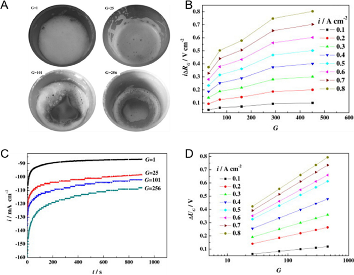 | Fig. 7. (A) The states of hydrogen foam in electrolyte after chronoamperometry measurement under various gravity. (B) The Ohmic voltage drop reduction (iΔRG) as a function of G value at various current densities. (C) Chronoamperometry curves for HER under various gravity conditions. (D) Cell voltage reduction (ΔUG) as a function of G value at various current densities for water electrolysis. Reprinted with permission [55]. Copyright 2010, Elsevier. | |