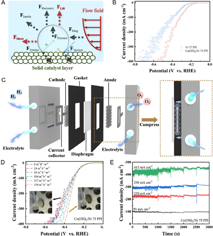 | Fig. 9. (A) Force analysis of single bubble on electrode surface under forced convection flow field. Reprinted with permission [45]. Copyright 2022, Elsevier. (B) Polarization curves of Ni and Co(OH)2/Ni electrodes. (C) Schematic of flow-through electrolyzer. (D) Linear sweep voltammetry (LSV) curves for Co(OH)2/Ni flow-through electrode with a pore size of 75 PPI under different flux, insets are optical images of the electrode surface with flows (right) and without flows (left). (E) Chronoamperograms of Co(OH)2/Ni flow-through electrodes with a pore size of 75 PPI under different current densities and different flux, the flux is increased every 500 s. Reprinted with permission [49]. Copyright 2022, Elsevier. | |