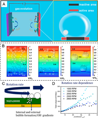 | Fig. 1. (A) Schematic illustration of the growth of gas bubbles on a flat film electrode, which caused a large number of inactive sites to form. Reprinted with permission [64]. Copyright 2019, American Chemical Society. (B) Simulation of the influence of different bubble sizes and quantities on the electrolyte potential distributions for 3D-printed Ni (3DP Ni), 3DP Ni sample obtained at 1100 ℃ (3DP Ni-1100), and nickel foam (NF). Reprinted with permission [72]. Copyright 2023, American Chemical Society. (C) Schematic illustration of studying NiFeOOH catalysts for the alkaline oxygen evolution reaction (OER) with varying rotation rate. (D) Tafel slope vs. average current density (Tafel slope obtained over a 20 mV interval) under different rotation rate. Reprinted with permission [73]. Copyright 2022, Wiley VCH. | |
