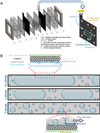 Shi et al. [45] constructed a novel the microfluidic electrochemical reactor (MER) by promoting the electrode and the liquid flow path. The electrodes of the MER device (Fig. 10A) were prepared by spraying, and 0.2 mg/cm2 catalysts were loaded on the side walls of the two electrode channels. A graphite plate with snake runner was used as the collector and cathode electrode, and Pt/C acted as the catalyst. For the anode, a planar electrode was used to demonstrate the fabulous performance of the cathode in a two-phase flow mode with forced convection. IrO2 was used as catalyst and microporous carbon paper was used as its support. The two poles were separated by a Nafion-117 proton exchange membrane, and the layers of the device were closely connected with each other, then good air tightness was realized. To control the electrolyte flow, two peristaltic pumps with the same single-channel pump head were used in the liquid drive module. After multiple cyclic voltammetry (CV) tests and LSV tests, it is worth noting that although the microchannel electrode had a smaller electrochemical active surface area (ECSA), its overall Ohmic resistance was significantly lower than traditional H-cell with less energy loss, which is attributed to the compact and integrated character of the device. This abnormal phenomenon results from the optimized bubble behavior, and the velocity is an essential factor affecting the bubble behavior. In narrow passages, the effect of flow rate is amplified, and low flow rate causes gas to inevitably gather. In addition to the shielding effect of the gas slug, at the liquid slug, even if the reactant is sufficient, bubble escape at low flow rates is still unfavorable. Insufficient supply of reactants at the liquid film will still increase Ohmic overpotential and concentration overpotential, which fails to reach the expected effect. However, as the electrolyte flow rate increases in Fig. 10B, the length of the gas slug become shortened gradually, and the average current density increases in a stepped way. When the flow rate reached a high velocity of 5 mL/min, shear force and lift force are dominant forces to change the behavior of bubbles and shorten their growth cycle, making bubbles diffuse and shrink in size, then the blockings are unblocked. At high flow rates, mass transfer is strengthened. Meanwhile, both the average current density and current stability greatly improved. When the flow rate exceeds a certain threshold, the current density reaches saturation. The long-term stability the whole system showed during the 28 h operation at a high flow rate full confirmed its potential for industrial application.