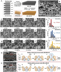 | Fig. 2. (A) Schematic illustration of the production process of SML-LMS-HE. The 120, 50 and 30 PPI means the nickel foams with 120, 50 and 30 pores per linear inch. (B) Scanning electron microscope (SEM) images of cross sections of SML-LMS-HE. Sets of photographs for the typical bubble release process from the surface of SML-LMS-HE (C-F), MMM-MMM-HE (H-K) and LMS-SML-HE (M-P). The diameter distributions of hydrogen bubbles ejecting from SML-LMS-HE (G), MMM-MMM-HE (L) and LMS-SML-HE (Q). (R) The bubble coalescing process in LMS-SML-HE. (S) The bubble splitting process in SML-LMS-HE. Reprinted with permission [101]. Copyright 2022, Elsevier. | |