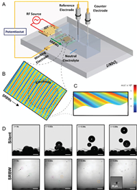 | Fig. 5. (A) Schematic depiction (not to scale) of the SRBW electrochemical cell. (B, C) Laser Doppler vibrometry scans of the SRBWs (20 dBm) propagating on the LiNbO3 substrate and through the WE (dashed outline); the color bar denotes the magnitude of the surface acceleration associated with the SRBW. (D) Representative time series images acquired using a high-speed camera (10,000 frames/s) showing the growth of bubbles trapped at the electrodes under silent conditions (top row), and under SRBW excitation at 20 dBm (bottom row). Identical bubbles are labeled by circles of the same color and the scale bars denote a length of 500 µm. Reprinted with permission [42]. Copyright 2022, Wiley VCH. | |