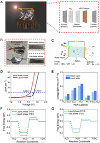 | Fig. 8. (A) The diagrammatic sketch of the electrocatalytic water vapor splitting device based on the wood structure. The inset is the schematic illustration of the electrocatalytic water vapor splitting device configuration. (B) Photograph of the setup for the electrocatalytic steam splitting. Insets are the photographs of setup before and after water splitting. (C) Sketch of the mechanism of the water vapor splitting electrolyzer. (D) Polarization curves of electrolyzer adopting Mo2C-Mo2N heterostructures as HER electrocatalyst at a scan rate of 5 mV/s in the vapor phase and liquid phase, respectively. (E) Summaries of the voltage at 10 mA/cm2 using the Mo2C-Mo2N, Mo2C, Mo2N, M-Mo2C-Mo2N and 20 wt% Pt/C as HER electrocatalyst in the liquid water and water vapor. (F) Free energy profiles of Mo2C-Mo2N heterostructures under different temperatures. (G) Free energy profiles of Mo2C-Mo2N heterostructures under different phase states. Reprinted with permission [46]. Copyright 2022, Wiley VCH. | |