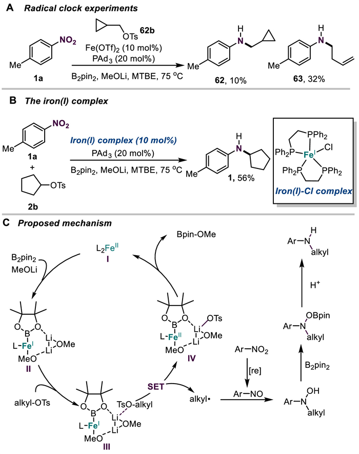 Subsequently, some experiments were performed to shed light on the mechanism of this iron-catalyzed amination reaction. First, this transformation could be completely depressed, when a radical scavenger TEMPO (200 mol%) was added under the standard reaction conditions (for details, see Supporting information). Moreover, a radical clock experiment was performed, and the major ring-opening product 63 was obtained (Scheme 3A). These results suggest that the radical pathway is dominant in this amination reaction, and the SN2 pathway is also involved. Subsequently, we attempted to investigate the possible intermediates in this transformation. In our catalytic system, nitrosoarene 64a-1 could be isolated, and according to the literature [27,29,30], some potential intermediates derived from nitrobenzene 64a were evaluated. As shown in Table S16 (Supporting information), nitrosoarene 64a-1 and N-phenyl hydroxylamine 64a-2 could provide moderate yields, while other compounds performed this transformation with lower efficiency (for details, see Supporting information), suggesting that nitrosoarene and N-aryl hydroxylamines were the plausible intermediates in the iron-catalyzed reductive amination. In our recent work [46,47], it was found that the iron/B2pin2/MeOLi catalytic systems could allow the high-valent iron species to be reduced to deliver the low-valent iron(Ⅰ)-boryl species. Therefore, a dppe-ligated iron(Ⅰ)-Cl complex [73] were synthesized, which could indeed promote this amination, affording the desired product in moderate yields (Scheme 3B). These outcomes suggest that iron(Ⅰ) species might be participated in the catalytic cycle.