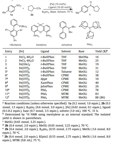 Given these considerations, we set out to study this iron-catalyzed amination reaction by the treatment of 1-methyl-4-nitrobenzene 1a and alkyl tosylate 2b with an iron catalyst in the presence of t-BuXphos. Reassuringly, the desired product 1 was obtained in 16% yield using MeONa as a base (Table 1, entry 1). After evaluation of various inorganic bases, MeOLi was found to promote this reaction smoothly with 25% yield (Table 1, entry 2; for details, see Supporting information). Various iron sources were further tested, and Fe(OTf)2 exhibited good performance, providing 1 in 31% yield (Table 1, entries 3 and 4; for details, see Supporting information). Solvents proved to be important for this transformation, and CPME was a good choice, yielding the desired product in 38% yield (Table 1, entries 5 and 6; for details, see Supporting information). Additionally, ligands were then checked, and the phosphine ligands facilitated this reaction well (Table 1, entries 7-9; for details, see Supporting information). Xantphos showed good reactivity, and 40% yield was obtained (Table 1, entry 8). To our delight, this reaction proceeded with good efficiency using bulky PAd3 [72] as the ligand, providing 1 in 78% yield (Table 1, entry 10). It is reasoned that electron-rich PAd3 ligand with bulky group may favor the generation of alkyl radical to facilitate the amination reaction. Switching CPME to MTBE and increasing the concentration afforded the best results, furnishing 1 in 86% isolated yield (Table 1, entries 11 and 12). Without the borane reagent, no desired product was observed (for details, see Supporting information). Other reductants such as Zn and Mn, were also examined, as anticipated, which could not promote this amination reaction (for details, see Supporting information). Furthermore, control experiments demonstrated the importance of iron catalyst and ligand, and only 12% yield was obtained in the absence of iron and ligand (for details, see Supporting information). The high-purity iron catalysts were examined as well, and comparable yields were provided (for details, see Supporting information). These results suggest that this transformation is promoted by the iron catalyst.