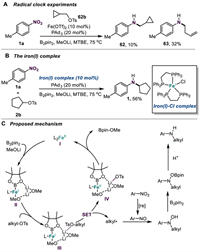 On the basis of these mechanistic studies, a plausible mechanism is proposed (Scheme 3C). First, Fe(Ⅱ) species was reduced by B2pin2 with the assistance of MeOLi to form a low-valent iron(Ⅰ)-boryl complex [47]. The resulting intermediate Ⅱ could coordinate with alkyl-OTs to produce alkyl radicals via a Li cation-assisted single electron transfer pathway. Additionally, nitroarene could be reduced to form nitrosoarene in the iron/borane reagent/alkoxide catalytic systems [45]. Subsequently, the in situ generated alkyl radical was trapped by nitrosoarene to afford the N-aryl hydroxylamine. Finally, the resulting N-aryl hydroxylamine reacted with B2pin2 and underwent protonation to afford the coupling amination product [44].