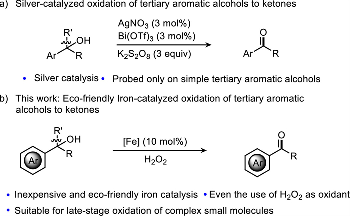 In a constant search for cleaner methods, there is a definite need for catalytic oxidations that use an inexpensive biorelevant metal as the catalyst and dioxygen (O2) or H2O2 as the stoichiometric oxidant [43-52]. Herein, we describe an unprecedented iron-catalyzed oxidation of diverse unstrained tertiary aromatic alcohols to arylketones even with H2O2 as the oxidant. This newly developed methodology utilizes inexpensive and eco-friendly reagents and tolerates oxidation-labile functional groups, and enables late-stage oxidation of complex molecules (Scheme 1b).