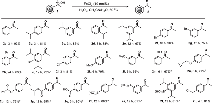 | Scheme 2. Scope of tertiary aromatic alcohols. Reaction conditions (unless otherwise noted): substrate (0.25 mmol), FeCl2 (0.025 mmol), H2O2 (0.75 mmol), MeCN (1.0 mL), H2O (1.0 mL), 60 ℃, air. a substrate (0.25 mmol), FeCl2 (0.025 mmol), H2O2 (0.75 mmol), K2S2O8 (0.25 mmol), MeCN 1.0 mL, H2O 1.0 mL, 80 ℃, air. | |
