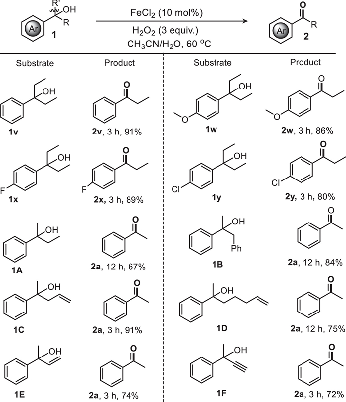 | Scheme 3. Scope of tertiary aromatic alcohols. Reaction conditions (unless otherwise noted): substrate (0.25 mmol), FeCl2 (0.025 mmol), H2O2 (0.75 mmol), MeCN (1.0 mL), H2O (1.0 mL), 60 ℃, air. | |