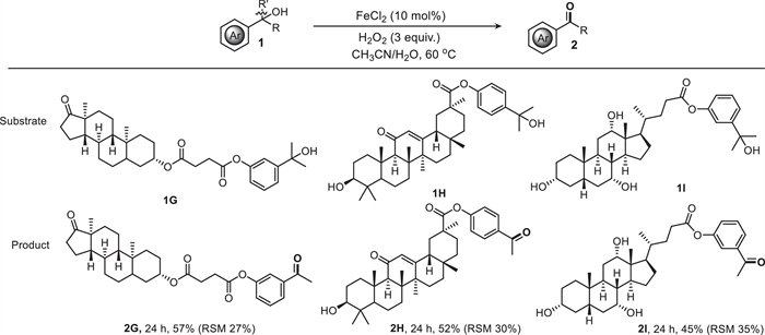 To further demonstrate the utility of this method, late-stage oxidation of complex molecules was evaluated (Scheme 4). 1G derived from bioactive epiandrosterone was a competent substrate and provided the desired ketone 2G in a synthetic useful yield. Similarly, a glycyrrhetnic acid derivative bearing an oxidation-sensitive hydroxy group also proceeded well. Remarkably, cholic acid-derived tertiary aromatic alcohol containing even three hydroxy groups was identified as a viable substrate, making this method more attractive in organic synthesis.