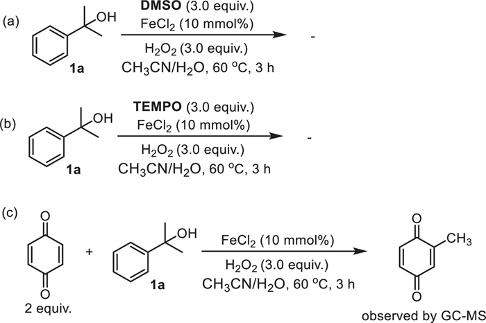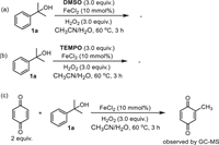 To probe the possible catalytic pathway of the transformation, controlled experiments were carried out (Scheme 5). DMSO, a hydroxyl radical scavenger, was applied with the reaction of 1a, leading to completely inhibition of the reaction [56,57]. This finding suggests that a Fenton process may be present (Scheme 5a). When the reaction was run in the presence of a radical quencher, 2,2,6,6-tetramethylpiperidine N-oxide (TEMPO) [58,59], no reaction occurred (Scheme 5b). Furthermore, introduction of a radical-capture reagent, 1,4-benzoquinone to the reaction of 1a trapped a methyl radical to give methyl-p-benzoquinone detected by GC–MS (Scheme 5c). In addition, α-methylstyrene was not observed during the reaction of 1a, suggesting that a dehydration-oxidation process might be ruled out.