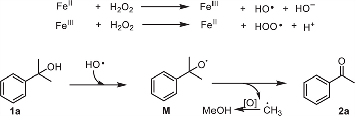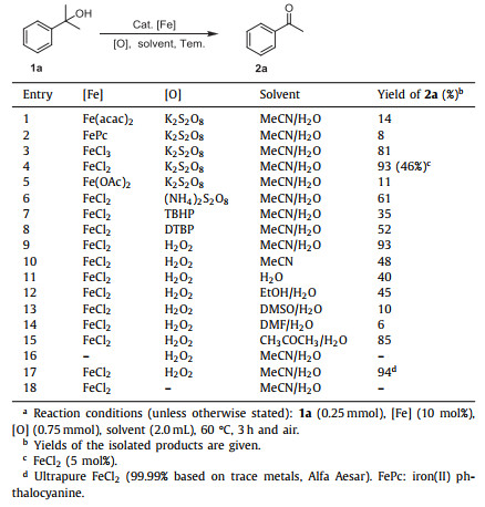 Encouraged by our recent studies on iron-catalyzed oxidations [53,54], we initially investigated the iron-catalyzed oxidation of 2-phenyl-2-propanol (1a) with K2S2O8 as an oxidant in MeCN/H2O and at 60 ℃ (Table 1). When Fe(acac)2 was used, 14% of the desired ketone 2a was observed (entry 1). Other iron sources such as FePc and Fe(OAc)2 resulted in poor results, whereas FeCl3 and FeCl2 can give much better results (81% and 93%, respectively) (entries 2–5). The use of various oxidants was also examined: (NH4)2S2O8, TBHP, and DTBP were inferior to K2S2O8, and environmentally benign H2O2 can give the optimal result (entries 6–9). Without H2O2, the reaction didn't work (entry 18). None of other solvents employed (MeCN, H2O, EtOH/H2O, DMSO/H2O, DMF/H2O, and CH3COCH3/H2O) could replace the MeCN/H2O (entries 10–15). No reaction was observed without an iron catalyst (entry 16). Further, the utilization of ultrapure FeCl2 (99.99% based on trace metals) resulted in a slightly better yield of 2a. These results indicated that trace quantities of other metals in the iron sources do not affect the efficiency of the transformation (entry 17).