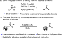 The oxidation of alcohols to ketones and aldehydes is among the most widely used class of oxidation reactions in organic chemistry [1-3]. However, this process is mainly limited to secondary and primary alcohols. Currently, oxidation of tertiary alcohols to ketones remains a challenge, as the transformation involves inert C−C single bond cleavage [4-17]. Consequently, examples of tertiary alcohol oxidations are rather rare, and their oxidative conversion generally requires a sufficient intrinsic reactive allylic alcohols, strained cyclic alcohols, and diols [18] Thus, expanding the scope of simple tertiary alcohol oxidations remains an important challenge.