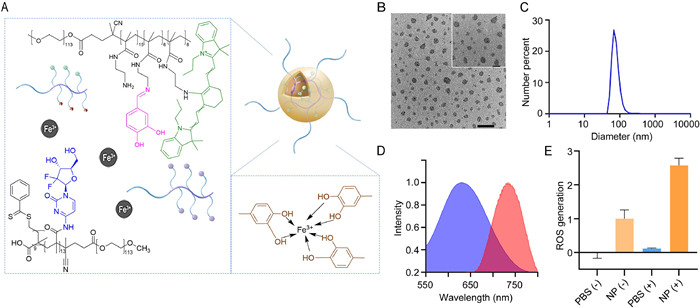 | Fig. 1. Design and characterization of NP. (A) Scheme of NP. (B) TEM images of NP. Scale bar: external 500 nm and internal 200 nm. (C) Size distribution of NP determined DLS. (D) Absorption (blue) and emission (red) of NP. (E) ROS generation of the NP under 660 nm laser irradiation. (+): with 660 nm laser, (−): without 660 nm laser, 1 W/cm2. Data are presented as mean values ± SD (n = 3). | |